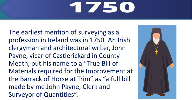 - 1750 -The earliest mention of surveying as a profession in Ireland was in 1750. An Irish clergyman and architectural writer, John Payne, vicar of Castlerickard in County Meath, put his name to a “True Bill of Materials required for the Improvement at the Barrack of Horse at Trim” as “a full bill made by me John Payne, Clerk and Surveyor of Quantities”.